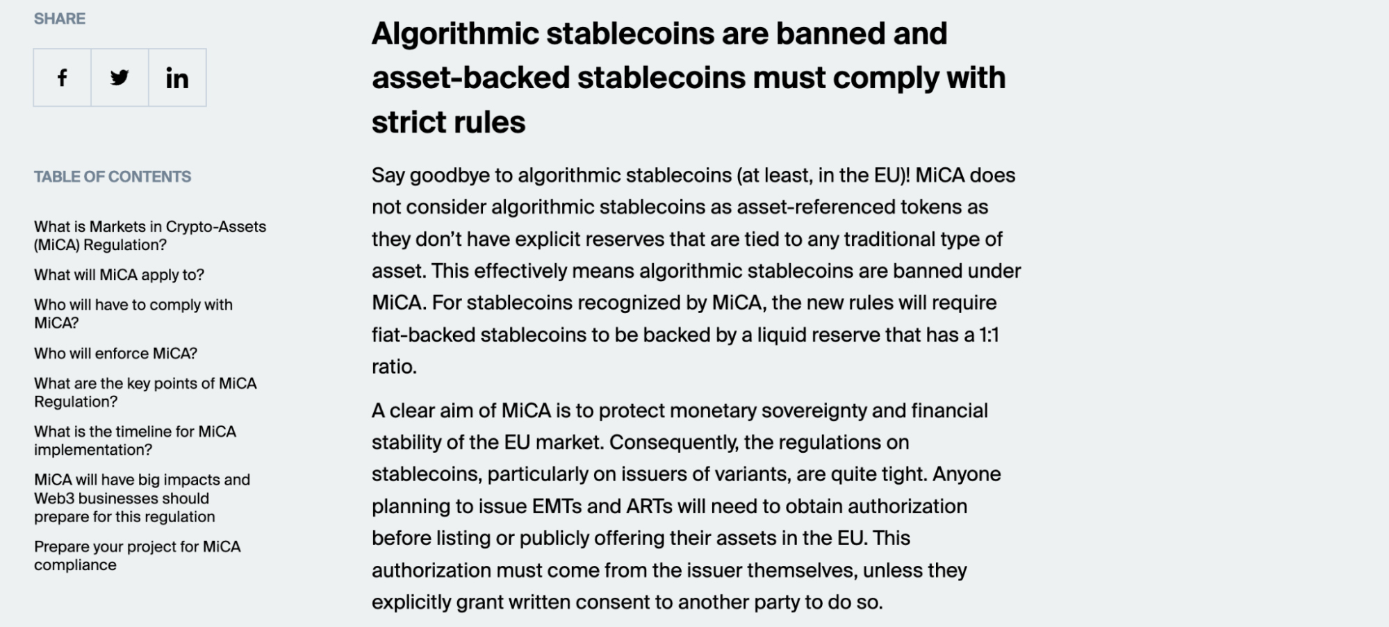 稳定币合规:以MiCA法规为例,针对其认可的稳定币,新规明确要求:所有由法币支持的稳定币,必须按照1:1的比例建立相应的流动性储备,以确保其价值的稳定与兑付能力。