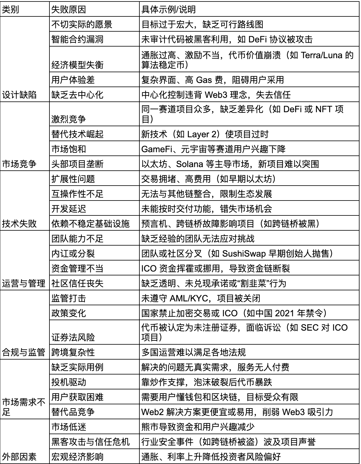 以下表格总结了这些失败原因及其具体表现,旨在帮助投资者、开发者和参与者识别风险,优化项目设计与管理,从而提高成功概率。如需深入分析特定项目或类别,可提供更多细节以进一步探讨。