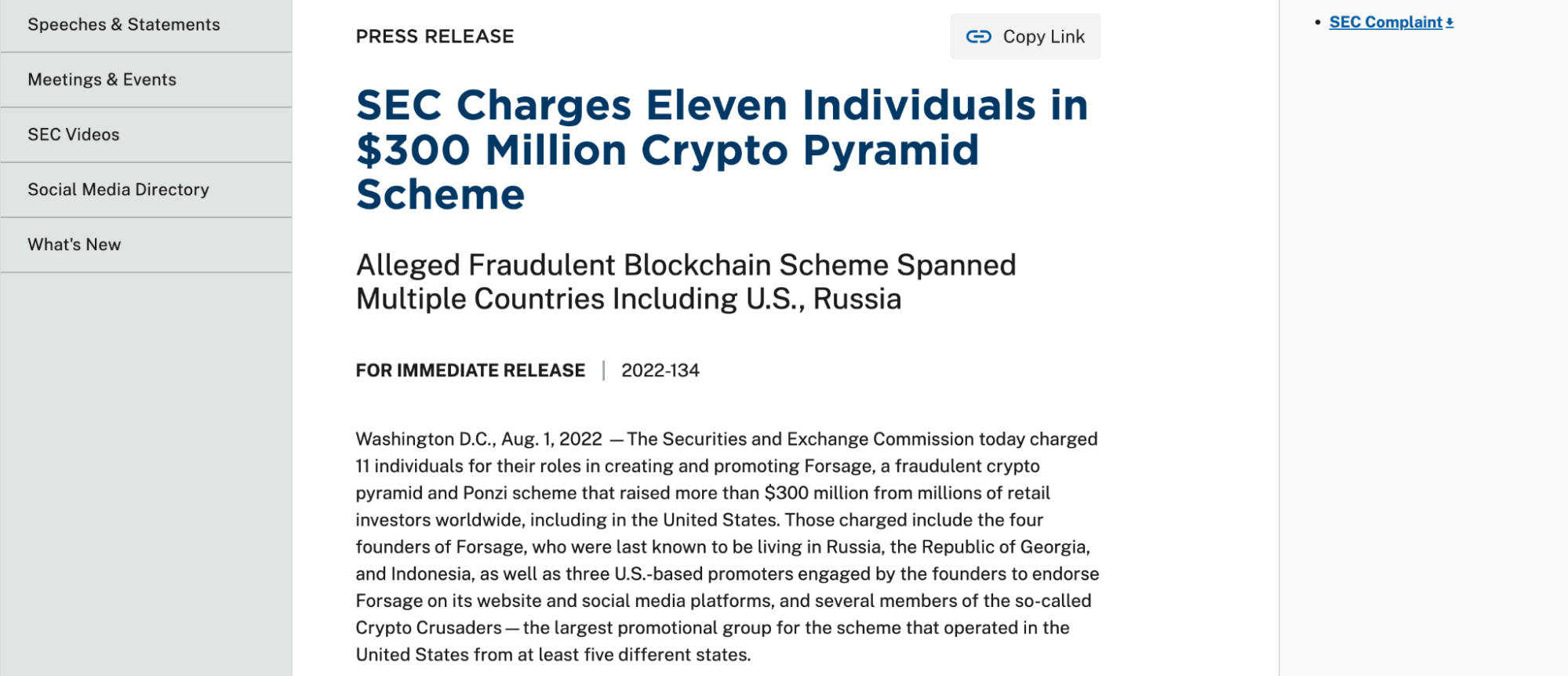 由于其"技术去中心化+模式中心化"的混合包装,一度被许多人误认为是创新的"Web3 DAO"。2022年,美国SEC将Forsage定性为未注册证券和非法庞氏骗局,创始团队部分成员被逮捕。
