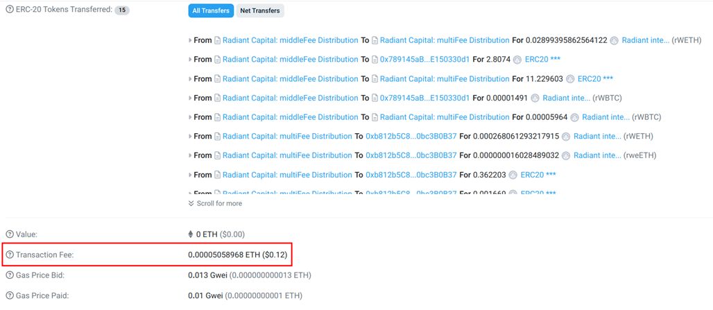 加密货币钱包会在你签名前显示交易的Gas成本。不过,你也可以在区块链上找到这些信息。在下面的例子中,我们可以在区块链浏览器中查看交易,比如ArbiScan(Arbitrum网络),如下图所示,或者Etherscan(以太坊网络交易)。