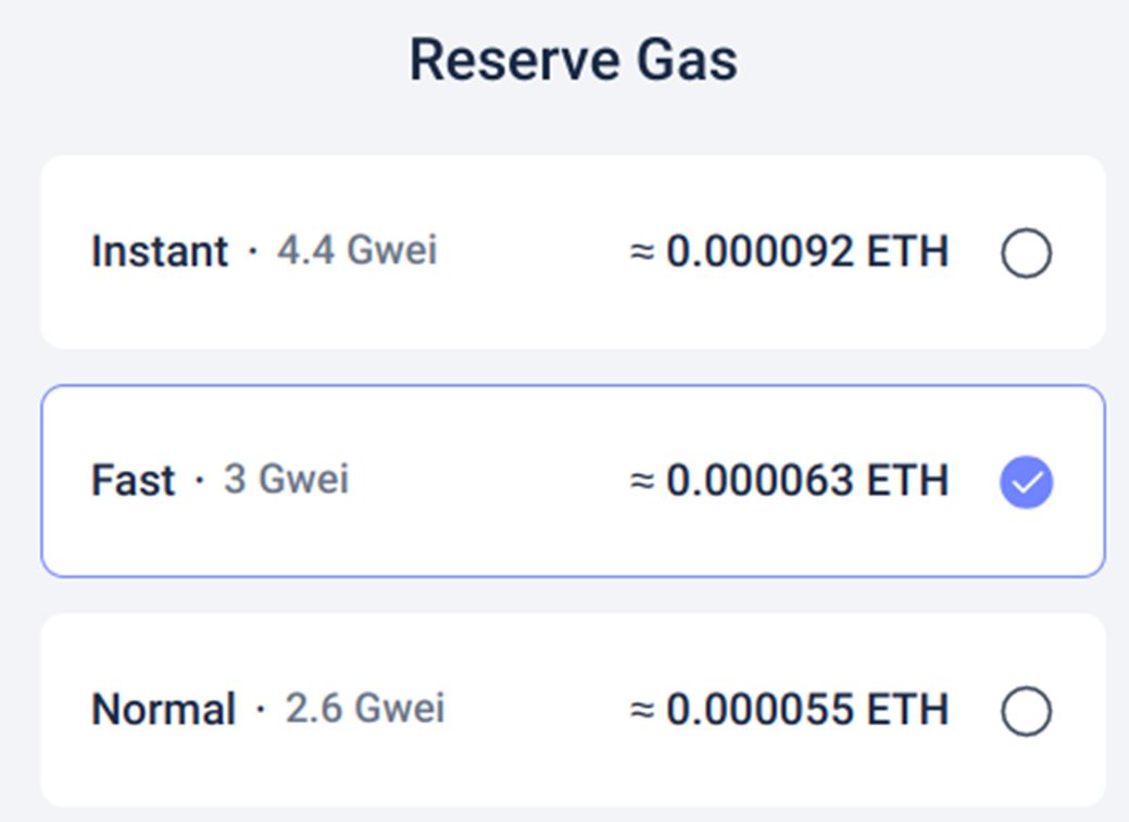 大多数加密货币钱包都会显示交易所需的以太坊Gas费用,并根据你希望完成交易的速度提供不同选项。此外,你还可以使用我们的Ethereum Gas Tracker工具随时查看确切费用。下面的例子显示了向另一个钱包地址发送ETH时的费用选项。