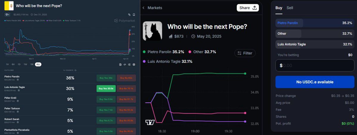 让我给你展示一个真实的案例。假设市场是"谁将成为下一任教皇?",有两个平台同时运行这个市场。我们为每个结果选择最低的价格:Pietro Parolin是35.2美分(在Myriad平台),Luis Antonio Tagle是30美分(在Polymarket平台),"其他"选项是32.7美分(在Myriad平台)。总计是97.9美分。