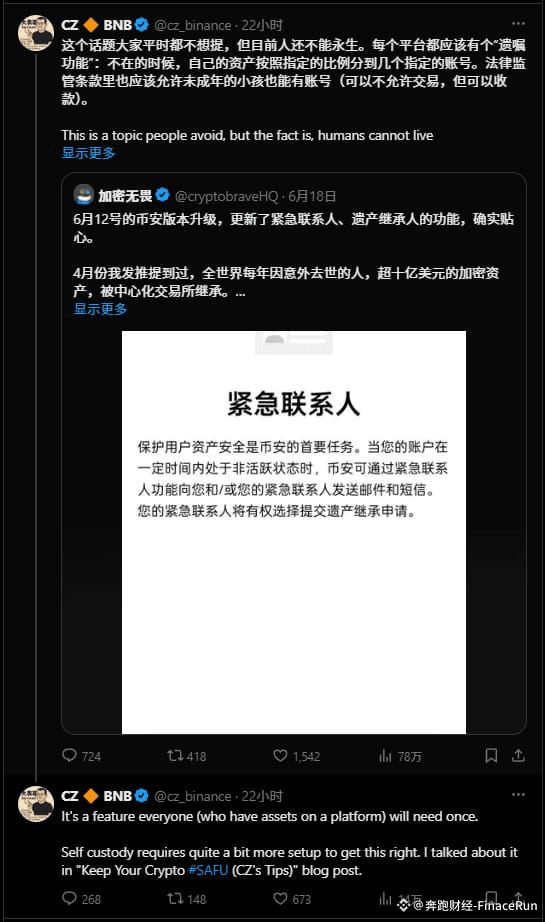 CZ的这番言论是在币安发布更新后,回应一位X用户时发表的。这位用户提到,币安在6月12日的版本升级中改善了紧急联系人和遗产功能,称这一举措考虑周到。该用户还引用了币安4月的一份声明,指出每年因意外死亡而通过中心化交易所继承的加密资产超过10亿美元。这位用户对币安实施这些更新表示惊喜,并希望其他加密交易所也能优先引入类似功能,以更好地处理突发情况下的资产管理。