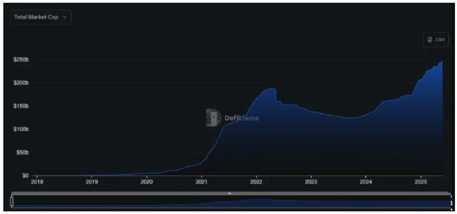 A4: 稳定币市场规模已达2470亿美元,超过了2022年5月创下的1870亿美元的峰值,自2024年初以来增长了90%。
