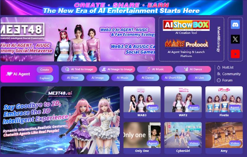 MEET48.ai是整个生态的"心脏"和价值沉淀的核心。它的定位,是一个专注娱乐领域的AI-Agent及AIUGC(AI用户生成内容)社区。其终极目标,是为用户提供极致的、个性化的、不可替代的情感链接。