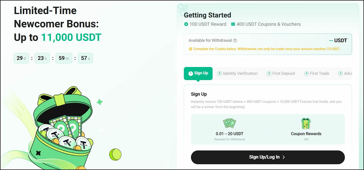 KuCoin 通过其奖励中心为新用户提供高达 11,000 USDT 的注册奖励。注册并完成 KYC 后,你将立即获得:100 USDT 代币、400 USDT 代金券以及 10,500 USDT 期货体验金。