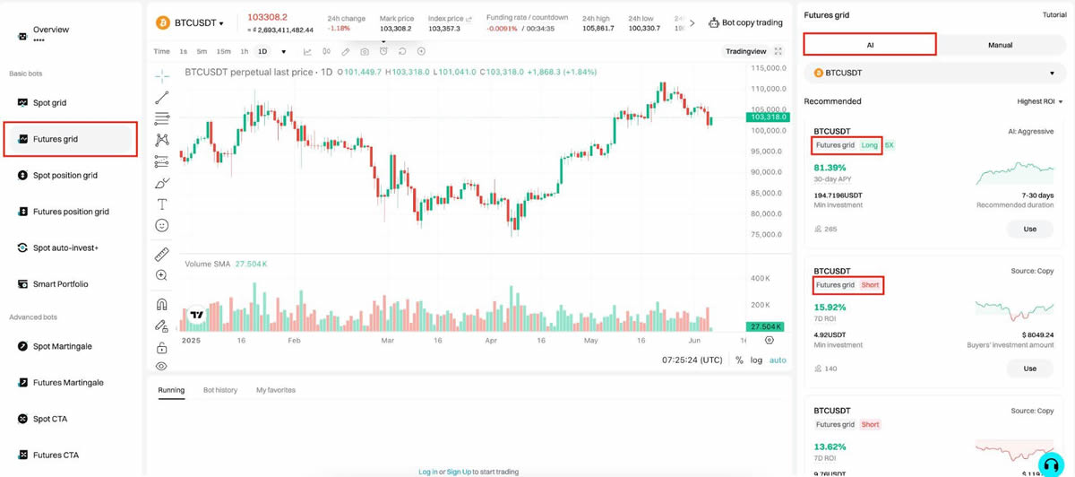 AI合约网格机器人是市场方向明确时快速且无需人工干预部署的理想选择。在稳步上涨趋势中使用AI多头机器人,在短期下跌趋势中使用AI空头机器人。