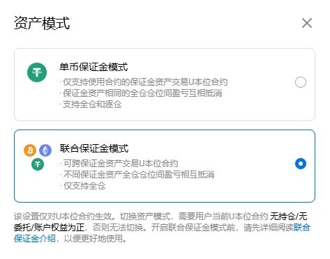 目前联合保证金模式仅在全仓模式下运作,暂不支持逐仓交易。