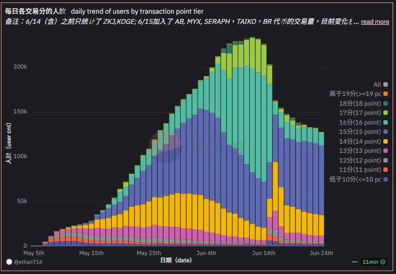 这些因素让热度有所降温,成本上升和收益下降非常明显,让一些用户不愿意冒着代币崩盘的风险去刷交易量赚空投,参与人数也随着时间慢慢减少。