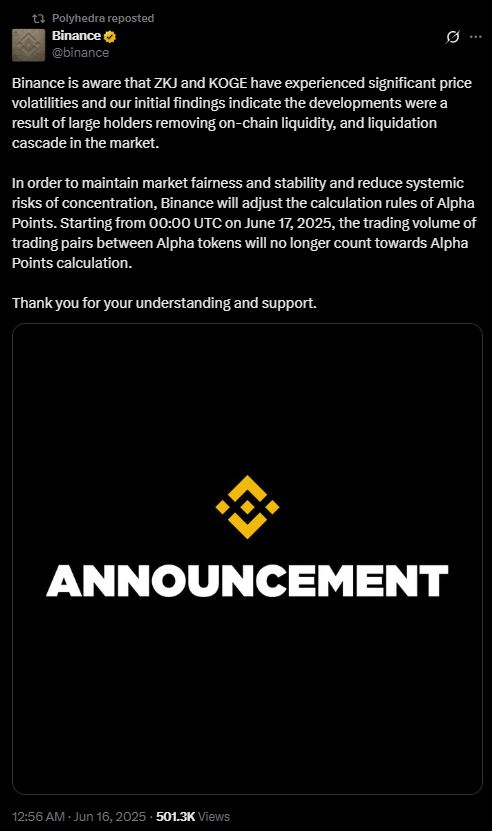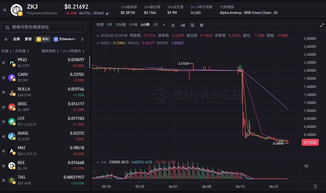从数据中我们也看到,在6月15日,最多Binance Alpha用户交易的$ZKJ与$KOGE崩盘事件造成一部分用户损失惨重,随后直接导致数万人离开Binance Alpha活动。虽然Binance官方表示这与交易所无关,但这确实损害了Binance用户的资产,这也是事后许多人才意识到的风险。