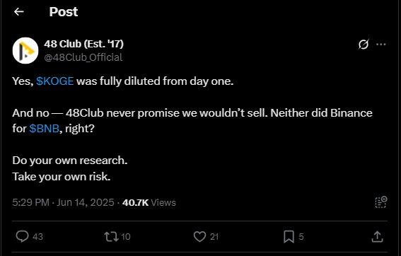可笑的是,$KOGE官方在崩盘前一天发推说:"我们从未承诺不卖出$KOGE,就像币安没有承诺不卖出$BNB"。这听起来像某种风险警告,第二天币价就直接跳水,崩盘时还不忘拉Binance一起背锅。
