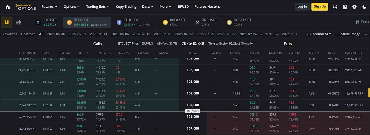 币安(官方注册 官方下载)作为全球最大的加密货币交易所之一,自2017年成立以来已服务超过2.5亿用户。凭借其出色的流动性和丰富功能,币安成为加密货币期权交易的首选平台。币安支持比特币(BTC)、以太坊(ETH)、币安币(BNB)、瑞波币(XRP)、狗狗币(DOGE)和Solana(SOL)等主流加密货币的期权交易,采用欧式定价并以USDT结算。