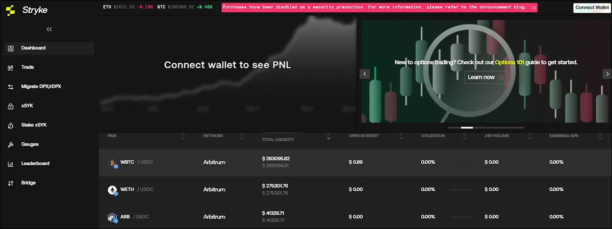 Stryke是一个基于Arbitrum构建的去中心化加密货币期权交易平台,由Dopex发展而来,专注于高级期权产品。您可以交易各种代币的期权,如WETH、WBTC、ARB以及$BRETT和$BOOP等memecoin。Stryke支持欧式和美式期权。