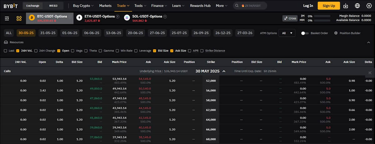 Bybit(官方注册、官方下载)是全球交易量领先的加密货币期权交易平台之一。它提供欧式期权,意味着您只能在到期时行权。Bybit支持比特币(BTC)、以太坊(ETH)和Solana(SOL)的期权,所有期权均以USDT结算。该平台提供丰富的到期日选择——每日、每两天、每周、每两周、每月、每两月和每季度。