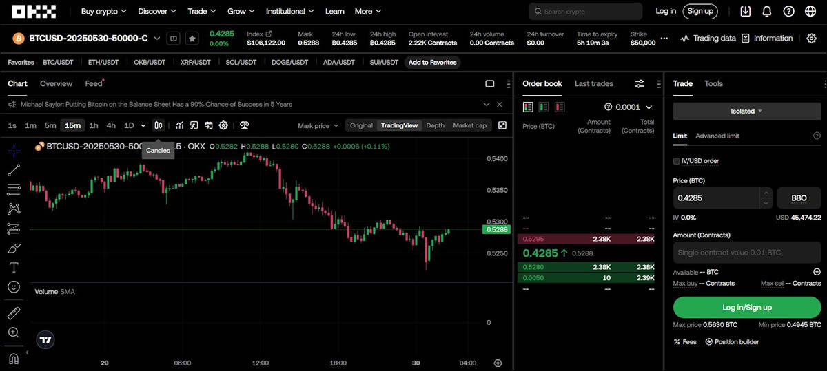 OKX提供实时数据、详细图表和简洁的交易仪表盘,助您快速做出决策。平台清晰展示期权希腊值、订单簿深度和价格趋势,让您轻松规划和管理风险。如果您需要策略帮助,可以使用工具创建价差和复杂的期权头寸。