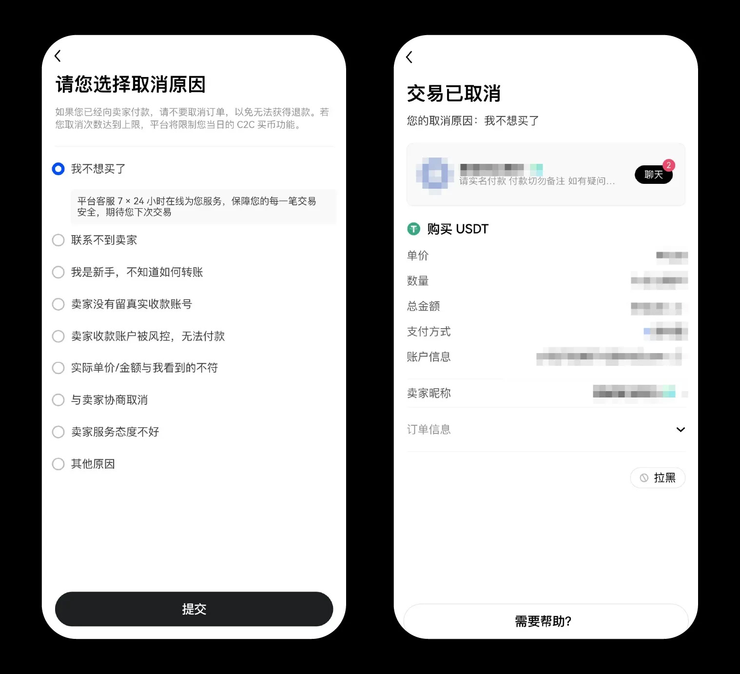 答:有区别。OKX新用户(注册后完成的C2C交易订单少于3个)当日付款前取消超过5次,或点击"支付完成"后取消超过3次才会触发限制;而老用户(注册后完成3个及以上C2C交易订单)当日付款前取消超过3次,或点击"支付完成"后取消超过1次就会触发限制。