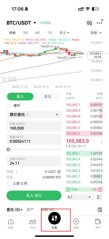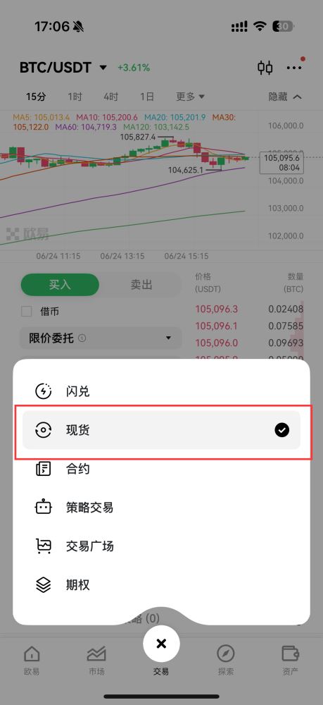 1、打开欧易app,进入首页,点击交易,进入现货交易界面