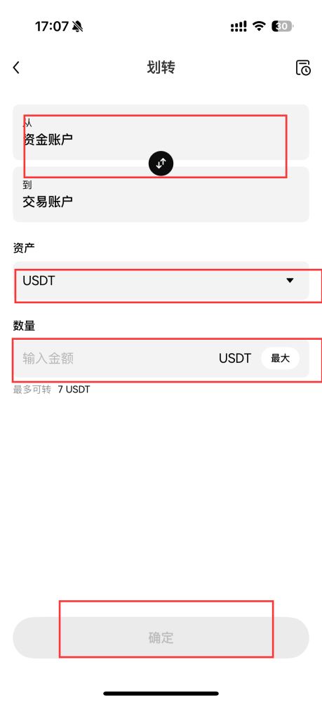 3、将C2C购买的USDT从资金账户划转到交易账户,输入数量,点击确认后,回到交易界面