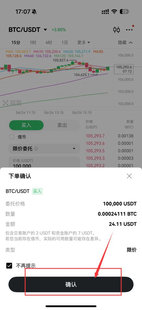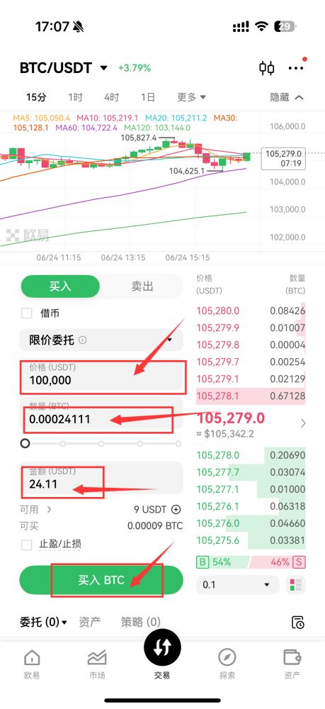 4、输入预期购买价格,输入购买数量或购买金额后点击买入BTC