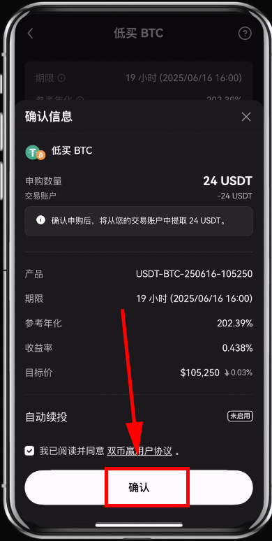 - 阅读订单概要,勾选同意 "双币赢投资用户协议",再次点击 "确认" 即可完成申购。