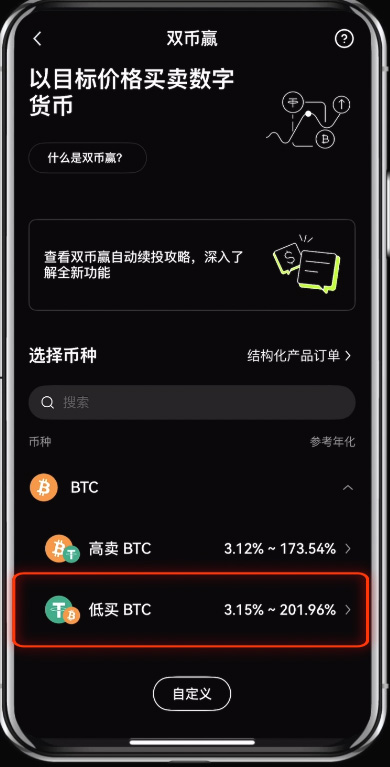 - 找到 "双币赢" 板块,选择你想要交易的数字货币,比如 BTC、ETH 等。