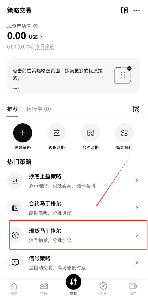 在OKX APP中,点击【交易】按钮,进入交易界面后选择币种,点击策略栏中的【策略首页】,然后选择【现货马丁格尔】,可以选择【AI策略】或【手动创建】方式来设置和运行策略。