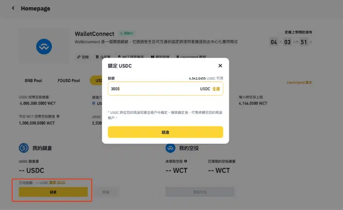 第二步:查看目前可用的奖池,以图中为例,有USDC、FDUSD 和BNB 三个奖池可以选择,点击对应奖池的【锁仓】按钮就可以进入如下的锁仓页面: