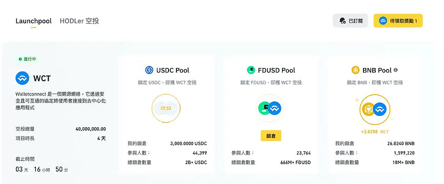 你会看到每个Launchpool 项目会有2-3 个奖金池,通常为BNB、USDC 和FDUSD 池。通常BNB 的奖池是最大的,也是竞争最大的。比如币安Launchpool 项目WCT 的奖池分布为: