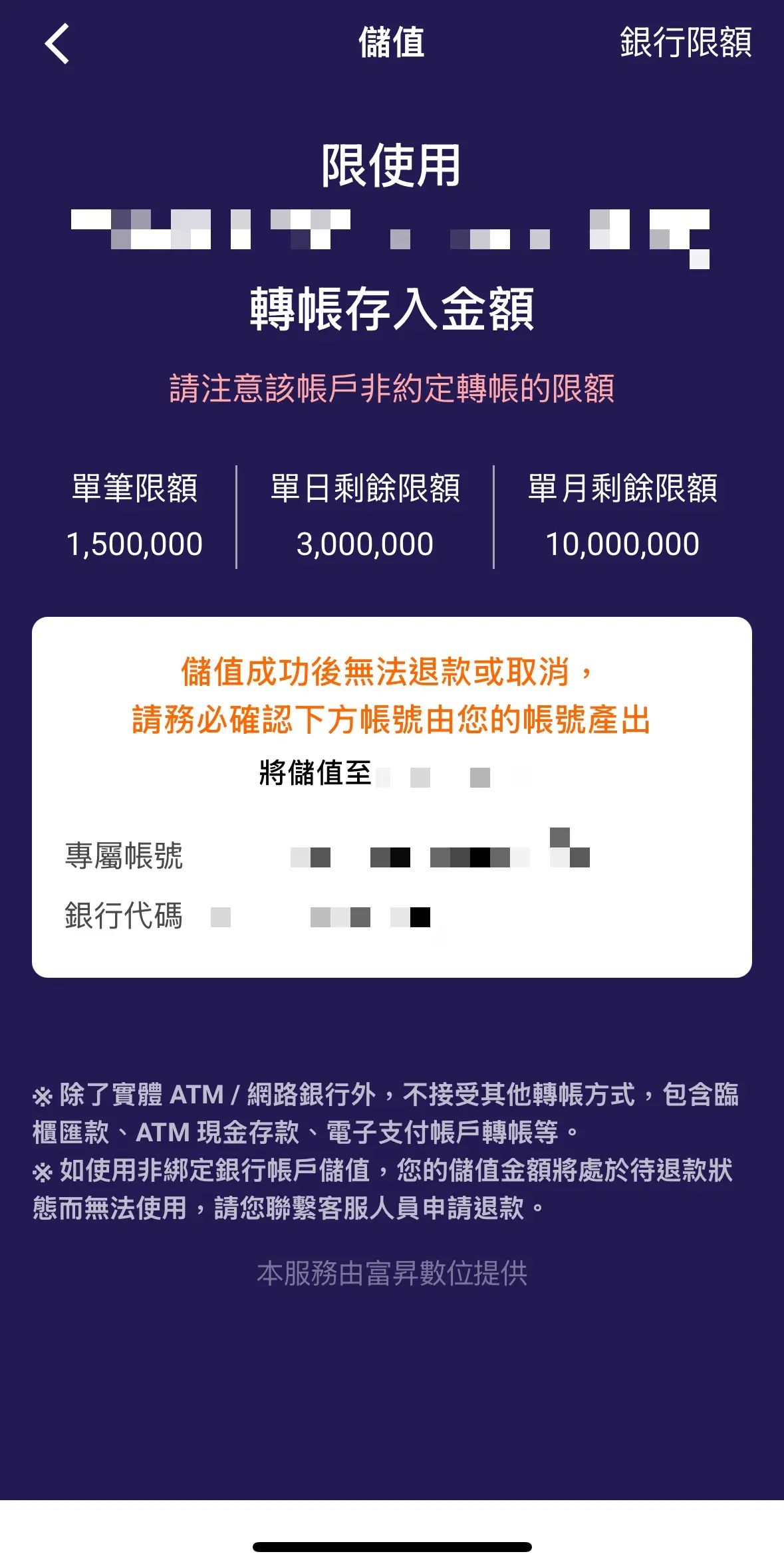 - 系统提供专属虚拟帐号(台北富邦银行)