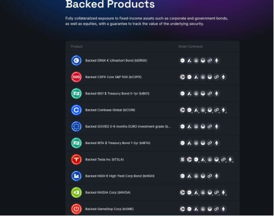 Backed是一家瑞士的资产代币化发行商,主要致力于将股票和ETF代币化。Backed已经在多条区块链上推出了bCOIN、bCSPX、bTSLA、bNVDA、bMSTR等10种美股代币。不过Backed本身没有推出美股代币交易平台,用户可以直接通过链上的DEX,如CoW swap、1inch等交易其推出的美股代币。