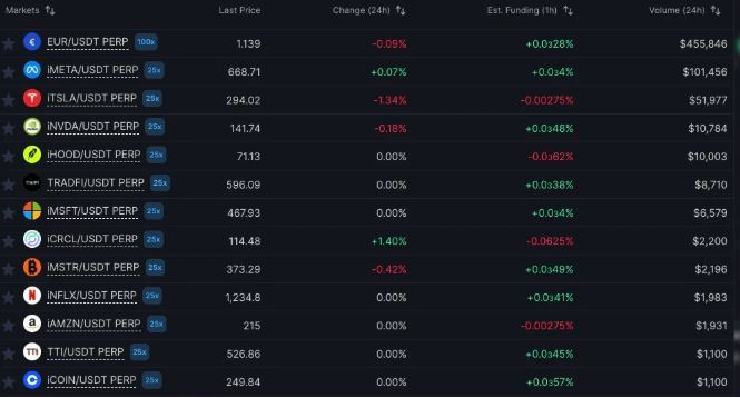 Helix上的iAssets是一种合成衍生品,背后没有实际托管的美股资产支持,而是纯粹以衍生品形式存在。这与MyStonks、Backed等平台采用的1:1实物股票担保模式不同。iAssets的交易方式与链上永续合约代币相同,支持7×24小时交易和25倍杠杆。