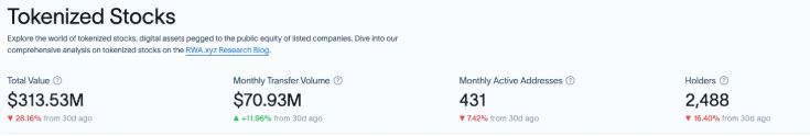 美股代币化确实有很多优势,比如可以打破地域和KYC限制,支持7×24小时全天候交易,让非美国用户低成本持有美国资产,避免高额跨境手续费等。然而,尽管机构曾预测美股代币化将带来万亿美元级的RWA市场,但根据RWA.xyz的数据,现在整个RWA市场规模只有约230亿美元,其中代币化股票仅占3.13亿美元,市场规模远没有达到预期的高度。