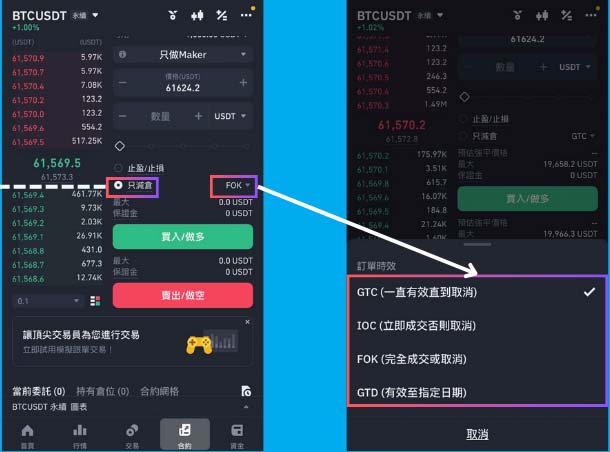 币安合约的成交时效与股票交易概念类似,分为GTC/IOC/FOK/GTD四种类型。