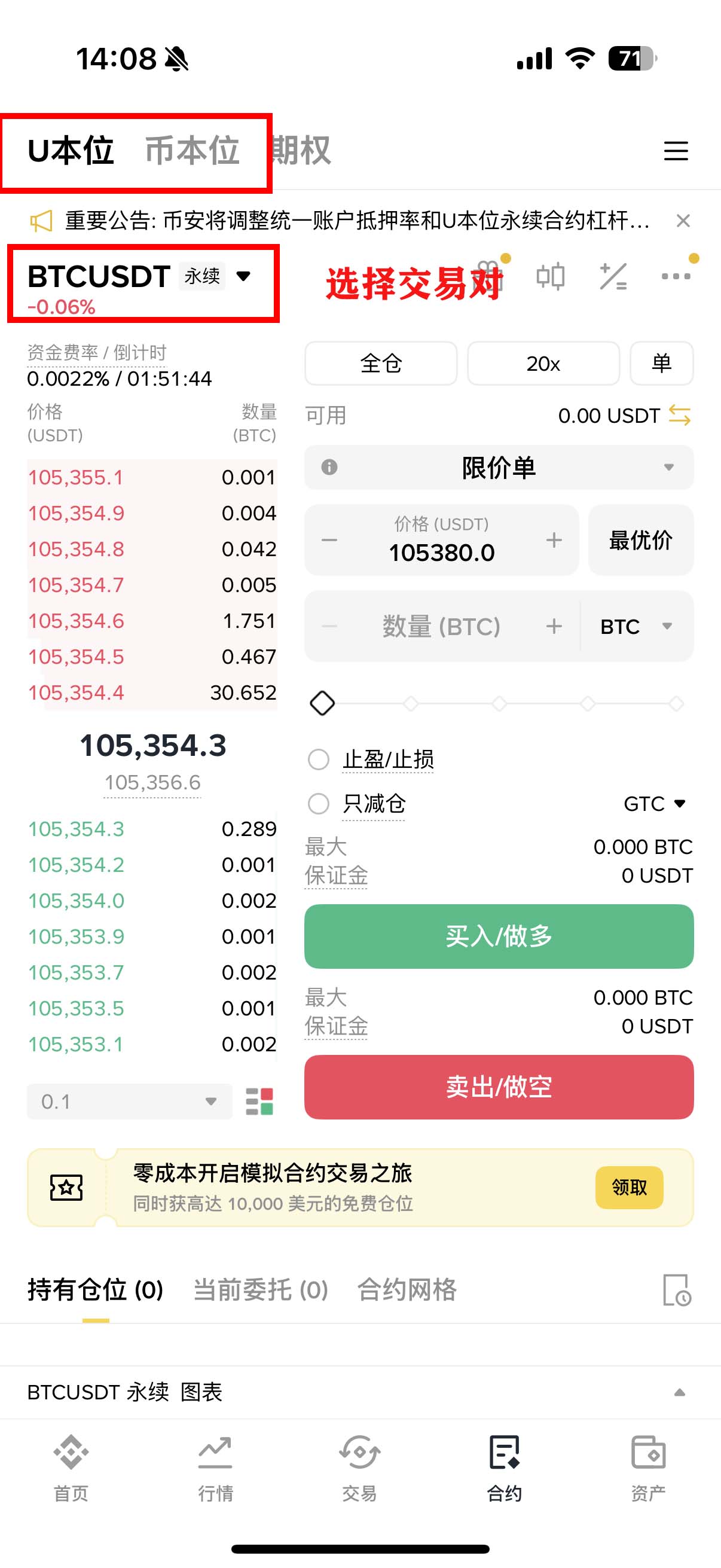 下面以BTC的U本位永续合约为例,详细介绍下单的具体步骤。