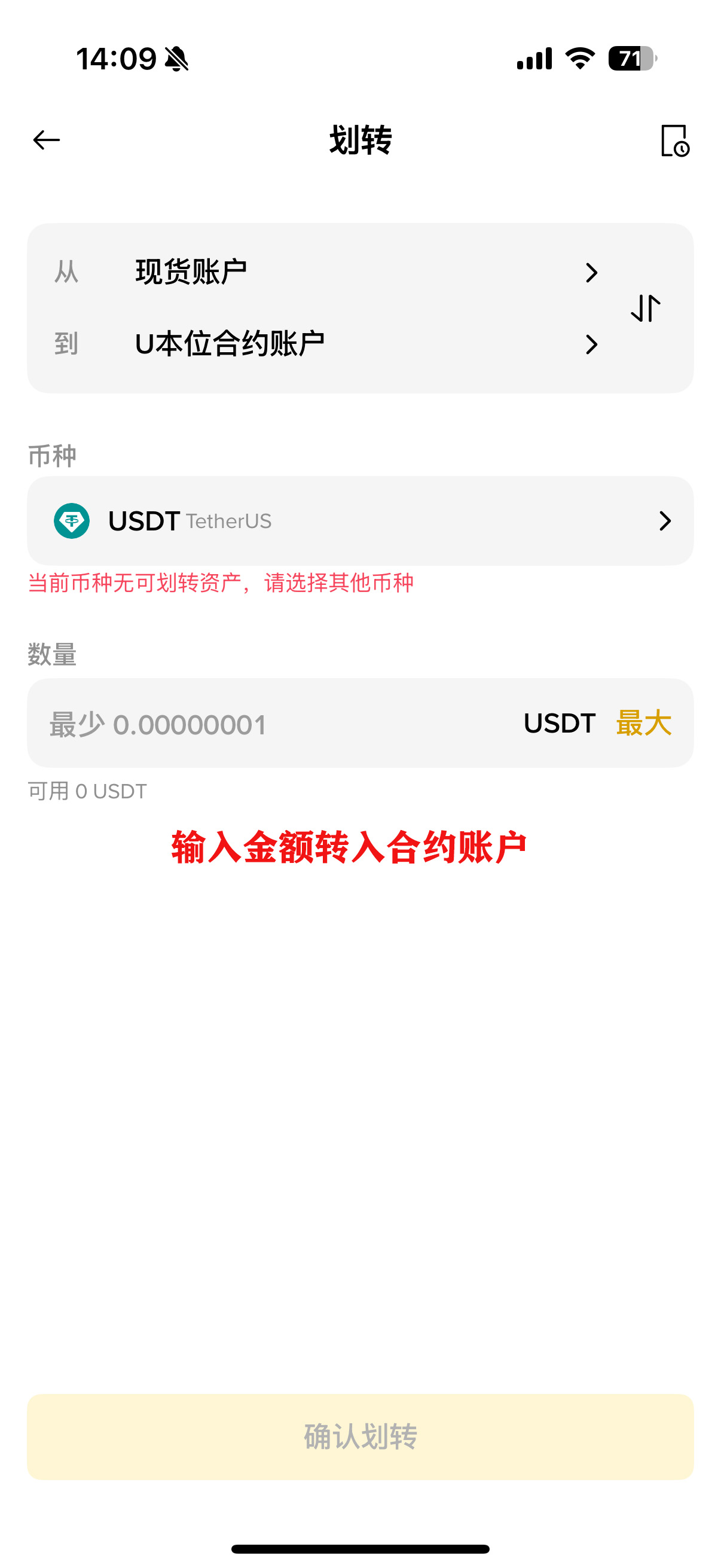 开始合约交易前,需要先存入保证金,所以要把资金转入U本位合约账户中。