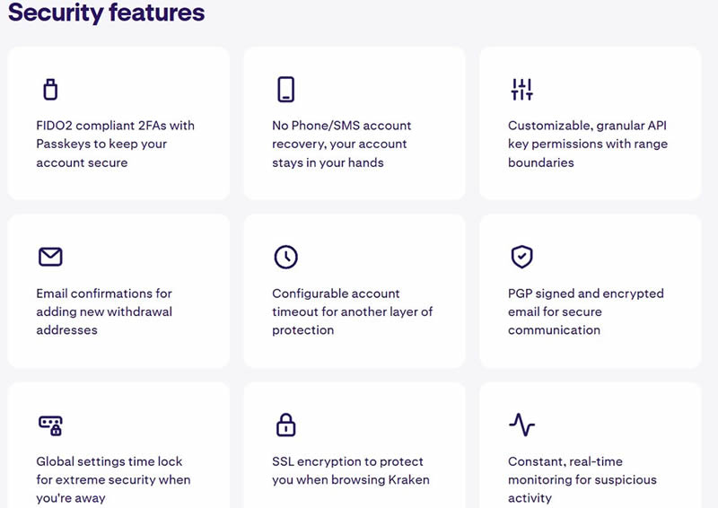 Kraken严格保护用户的加密资产,采用先进的程序防止用户资金被盗。该平台将95%的资金存放在分布于全球的隔离安全冷钱包中。公司高度重视用户资产安全,并采取了高级API权限控制、第三方储备证明审计等措施,以增强安全性和透明度,防止SIM卡交换攻击,从而赢得了安全可靠的声誉。
