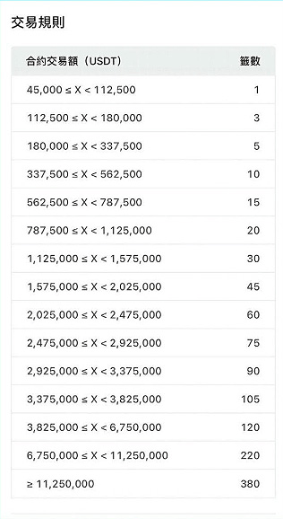 这项活动的基本门槛是45,000 USDT的交易量,虽然对一般用户来说条件不低,但对于套利交易者来说并不难达成,是一个可以好好利用的活动。