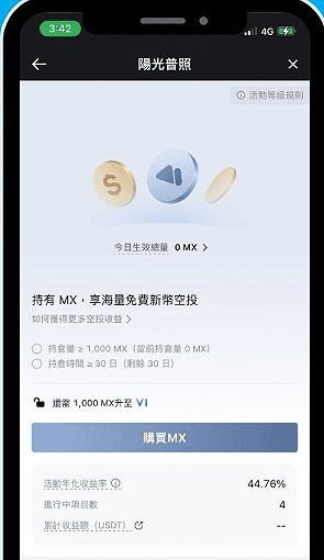阳光普照是抹茶推出的代币空投活动,持有越多的MX币,就能获得越多的免费空投。