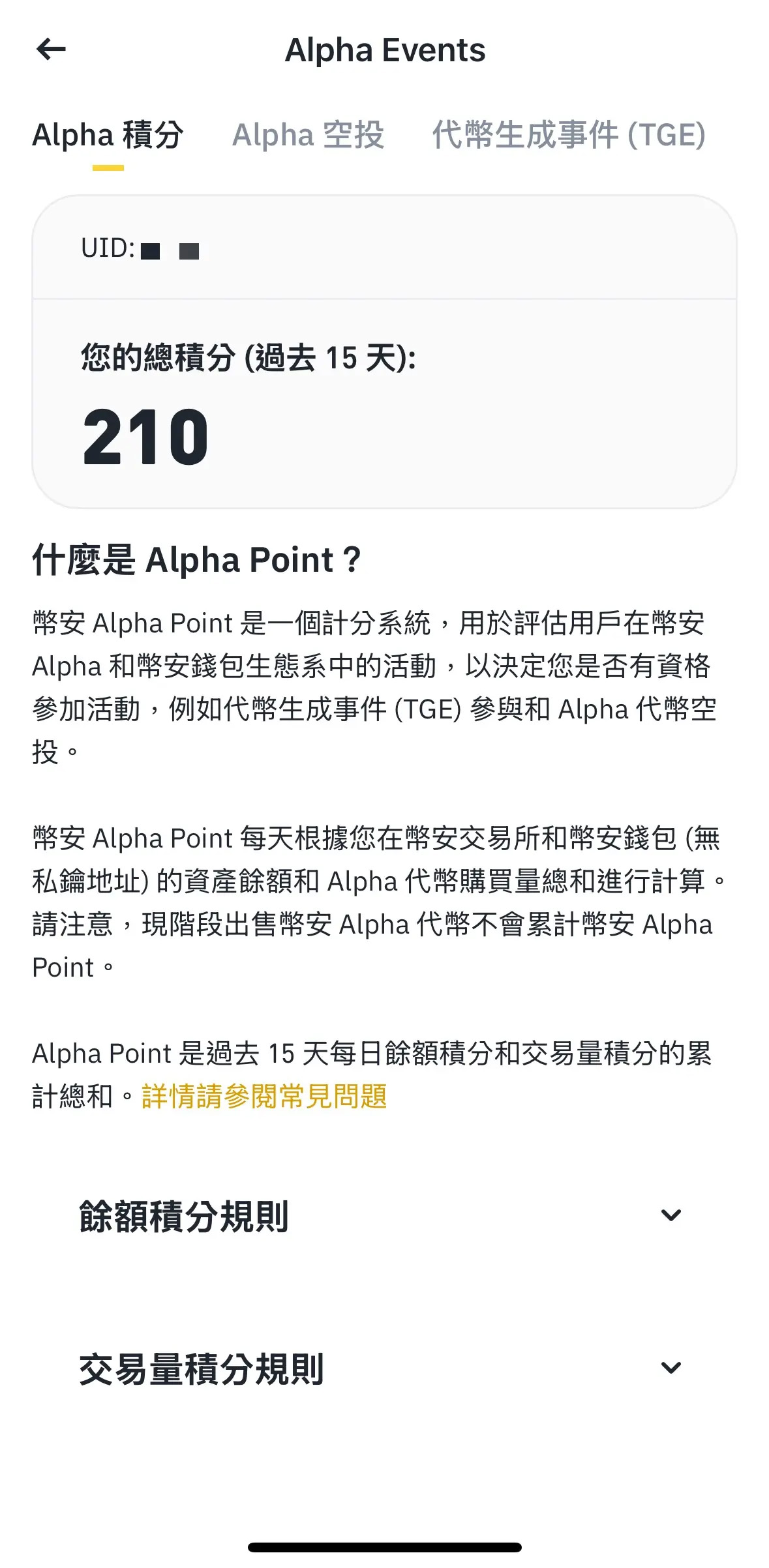 - 仅「买入」「Alpha」代币时,才列入交易量,换句话说如果卖出换回USDT/BNB,此段不列入交易