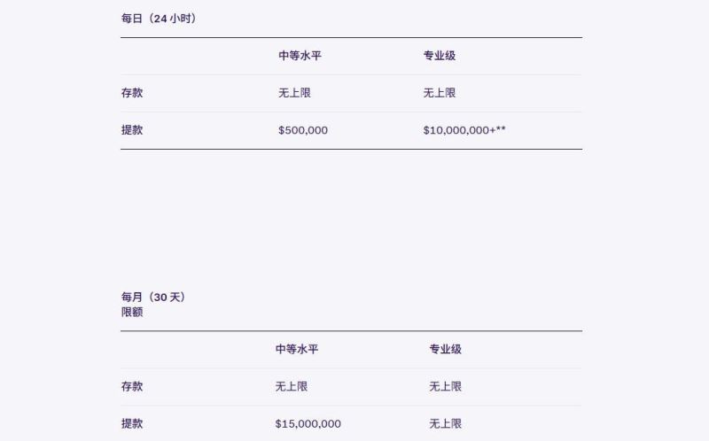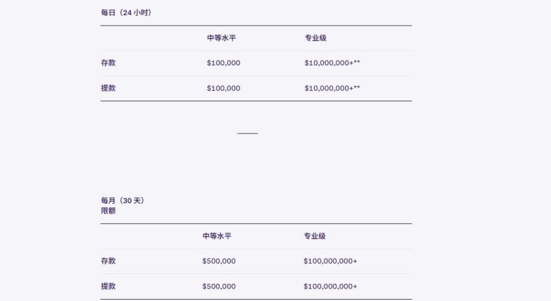 在法定货币方面,中等水平用户的每日提币限额为100,000美元,每月限额为500,000美元。专业级用户的法定货币每日提币限额同样为10,000,000美元以上,每月也没有限制。