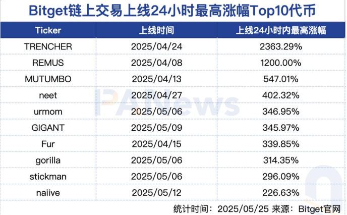 更值得关注的是,多个项目展现了极具吸引力的投资回报。根据PANews统计的Bitget链上交易上线24小时内最高涨幅排名前十代币,整体平均涨幅达到638.25%,体现了其强劲的市场表现与资金追捧程度。其中,TRENCHER、MUTUMBO和REMUS更是实现了数倍甚至数十倍的惊人回报。这些代币大多尚未登陆币安等主流交易所,是早期资产,这进一步印证了Bitget在捕捉早期优质资产方面的前瞻性与独立判断力。从时间分布来看,Bitget链上交易持续产出"黑马"项目,不仅有效吸引了市场注意力,也强化了其在早期资产发现方面的品牌影响力。