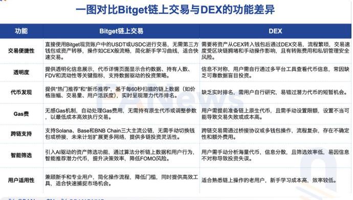 答:相比币安Alpha,Bitget链上交易采用无感Gas费机制,可在提升交易体验的同时显著降低用户的操作成本,有效激发用户活跃度,形成正向交易循环。此外,Bitget在项目筛选和上币节奏方面也有自己的特色。