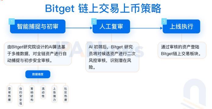 根据Bitget首次公布的上币策略,其链上交易的上币流程遵循"智能捕捉与初审 + 人工复审 + 上线执行"的三步策略(如下图所示),强调效率、安全与趋势并重,既有助于平台在竞争激烈的链上生态中占据先发优势,同时为用户筛选更可靠的潜力资产。