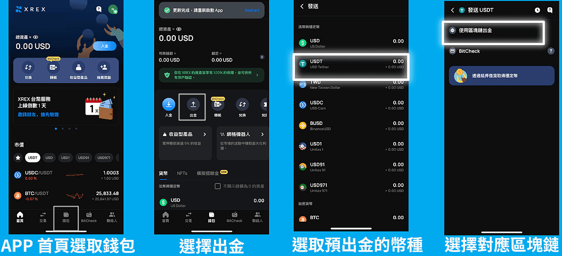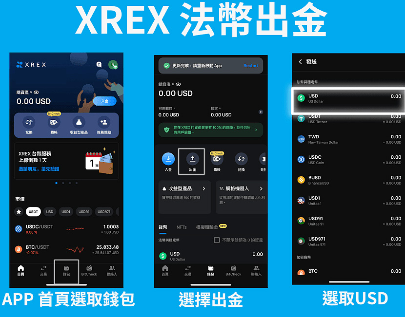 XREX支持三种主要出金方式:台币出金、美元出金和加密货币出金。同样,XREX是台湾少数支持美元出金的交易所。