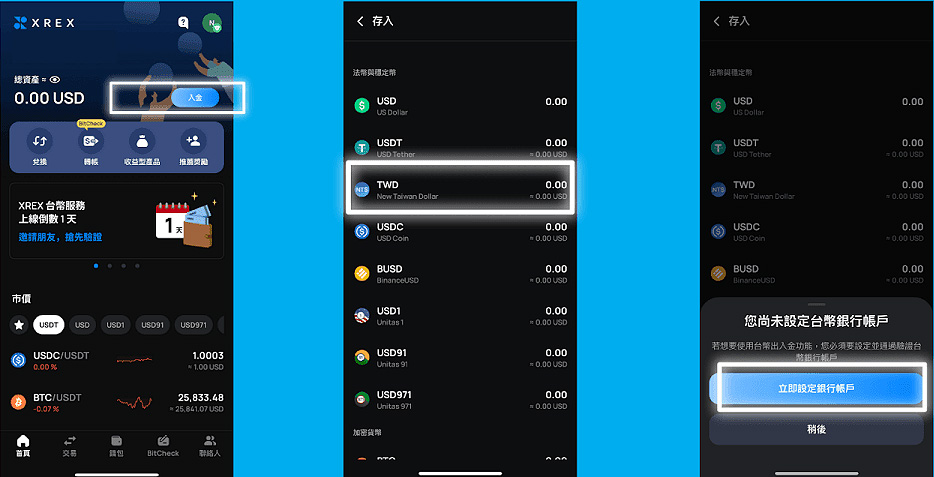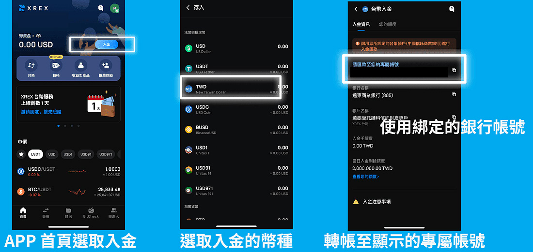 - 台币入金:可以直接用台币充值到XREX账户,然后购买你心仪的加密货币