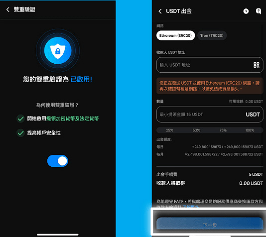 如果是第一次进行加密货币出金,需要先设置双重验证功能。