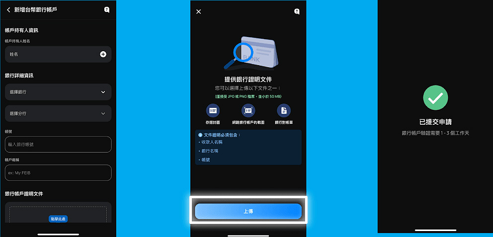 填写银行帐户资讯→【上传】→1~3个工作天审核即完成