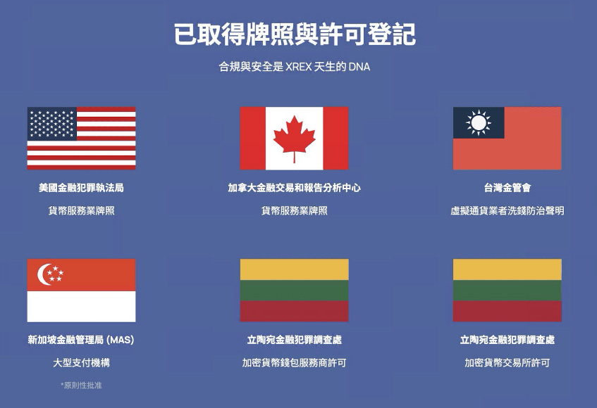 XREX是一家台湾本土的金融科技公司,成立于2018年,是一家合法运营的虚拟货币交易所,已获得台湾金管会的洗钱防治声明和加拿大货币服务商(MSB)牌照。