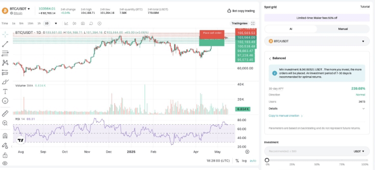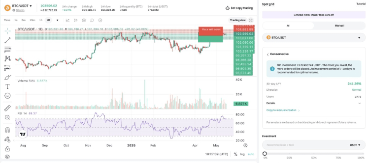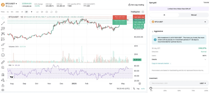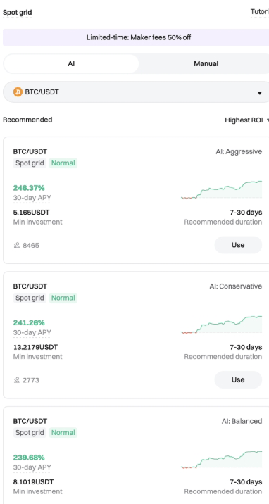 Bitget的AI推荐网格机器人(激进型、平衡型、保守型)不只是三种配置,更是应对市场波动的三种典型方式。每种方式都有多个实时变体,针对不同的用户偏好、波动情况和风险回报平衡进行调整。这些机器人不是固定不变的策略,而是表达了一个更广泛的观点:在市场不确定的情况下,依靠经验模式构建的策略,往往比单纯依靠个人判断更可靠。