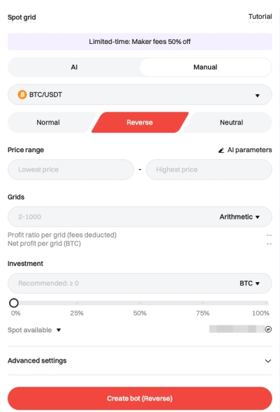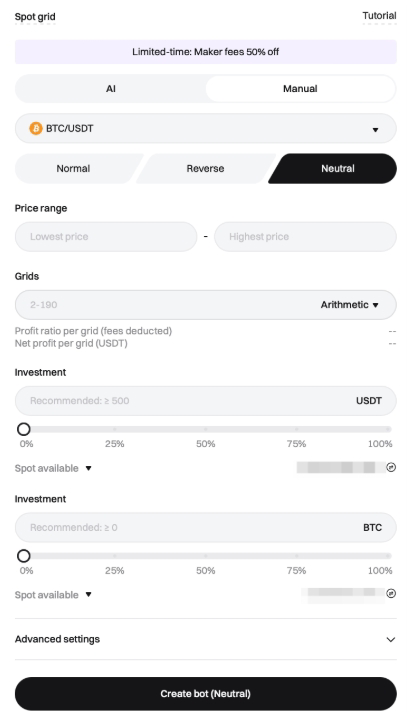 手动中性网格预设市场不是无限趋势,而是在特定背景下回归,通常围绕移动均衡点波动。它认识到,BTC和USDT等资产对会表现出内在的节律性行为,这些行为受流动性动态、心理锚定和日内失衡的影响。在此框架下,该策略不是将对称敞口视为被动中立,而是将其视为一种降低方向性风险的刻意方法。通过在交易对的两端均匀分配资金,系统增强了其有效再平衡的能力,无需预测性干预即可利用相对波动。